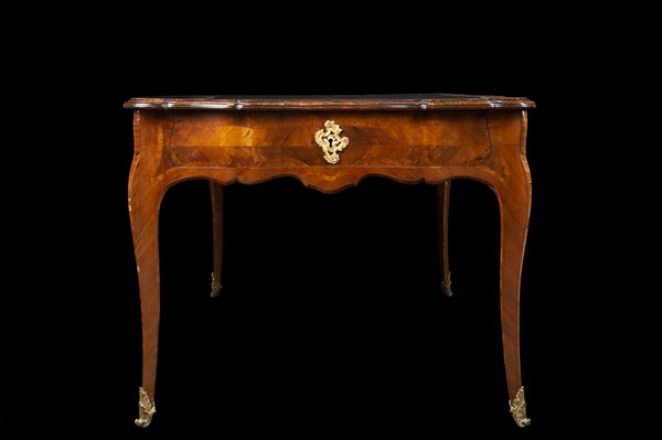 Louis XV veneered central desk. Chiselled and gilded bronze mounts and leather top. Genoa, 1750-60 circa (cm 173x99x78,5) (defects)