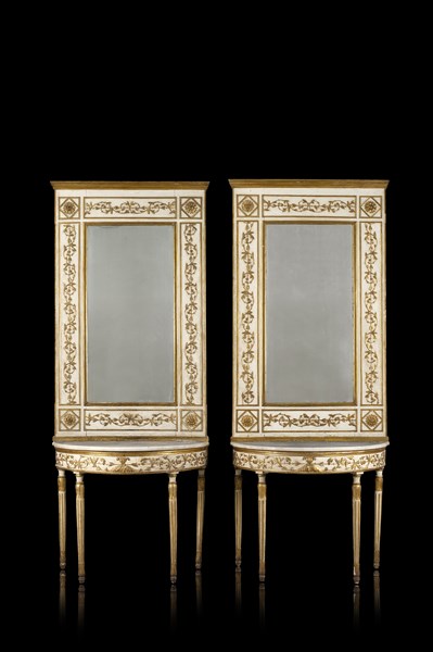 Coppia di console a mezzaluna con piani in marmo e specchiera in legno intagliato, laccato e dorato, decorato a volute fogliate, gambe rastremate. Napoli, secolo XVIII (console: cm 85x103x52; specchiere: cm 105x175) (difetti e restauri)