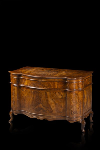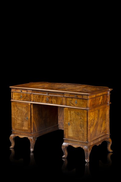 Scrivania da centro lastronata in radica di noce e radica d'ulivo, filettata in legno chiaro. Piano di forma mossa. Tre cassetti nella fascia sotto tre tiretti estraibili. Due ante rivelano due cassetti. Gambe mosse. Veneto, secolo XVIII (cm 113x73x64) (restauri)