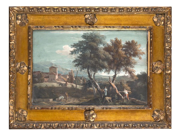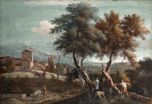 Marco Ricci Paesaggio con boscaioli e viandanti Tempera su carta, cm 31x46 Al re