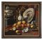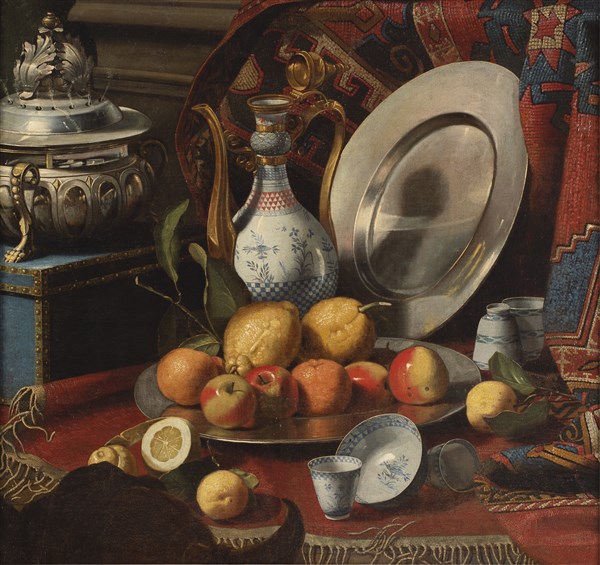 Still life with incense burner, trunk, fruit tray, teapot in chinese style porcelain, on table covered with Ushak carpet