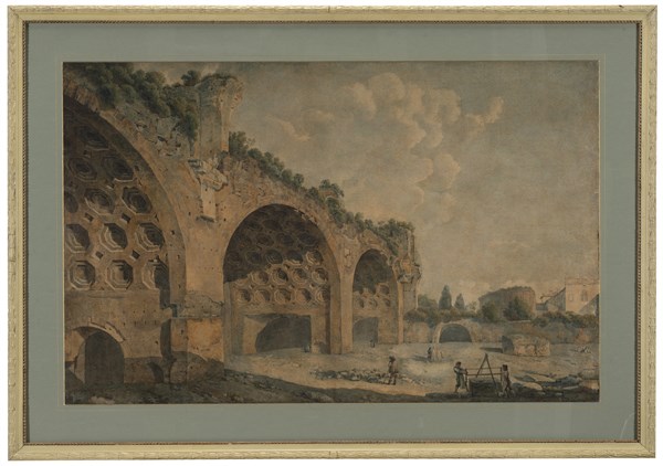 Of the subject, derived from a famous print by Piranesi, there is a version executed with the same techniques at the Musée Cantonal de Beaux Arts in Lausanne, and another version engraved by Volpato, and colored by Ducros, at the British Museum in London.