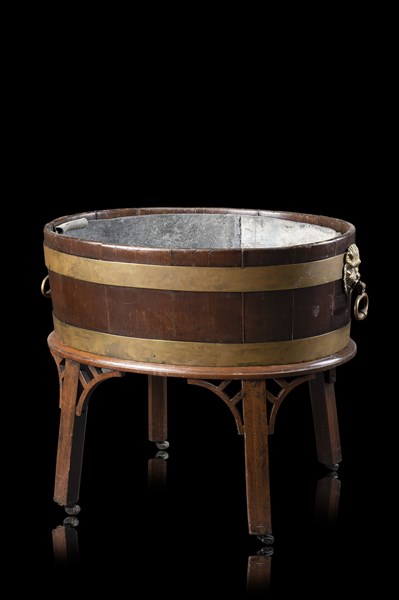 * Rinfrescatoio in mogano con vasca in zinco, fasce in metallo con anelli sorre