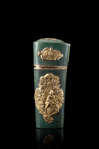 Porta nécessaire in pelle e oro decorato da fregi con scena orientale e fiere. Francia, secolo XVIII (difetti)