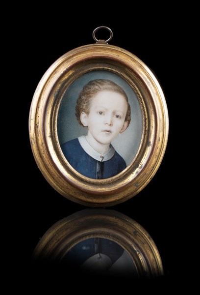 Maestro del secolo XIX "Fanciullo in giacca blu" miniatura ovale su avorio (cm 4x5) In cornice in metallo dorato