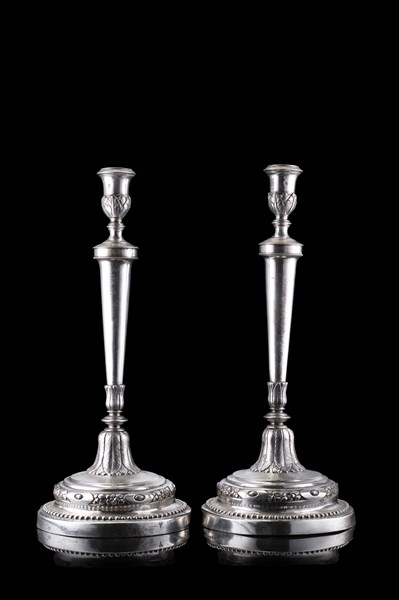 Coppia di candelieri in argento con fusto a colonna sbalzato e cesellato a foglie d'acanto e fiori. Secolo XIX (h. cm 32) (g 850) (difetti)