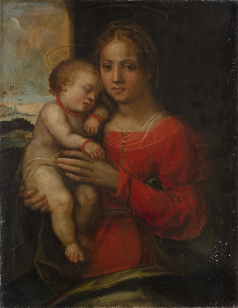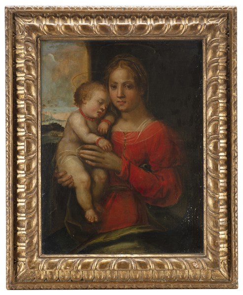 Scuola toscana dell'inizio del secolo XVII Madonna con Bambino Olio su tela, c