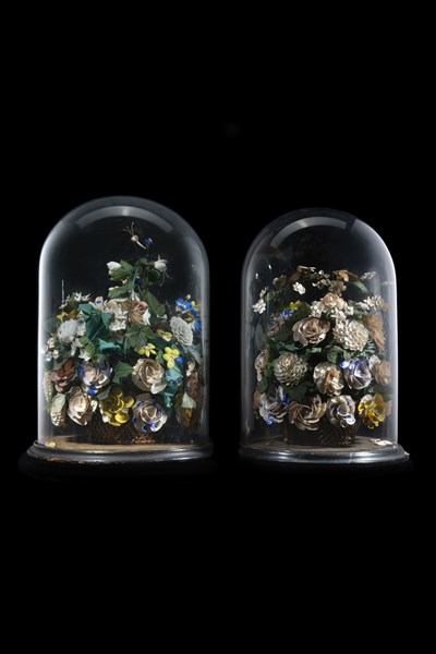 Arte inglese, secolo XIX. Coppia di composizioni in stoffa e conchiglie colorate simulanti cesto fiorito, entro teca (h. max cm 44) (difetti e mancanze)