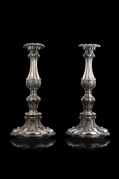 Coppia di antichi candelieri in lamina d'argento appesantiti. Elettrificati in epoca posteriore (h. cm 33) (g. 1600 lordi) (difetti)