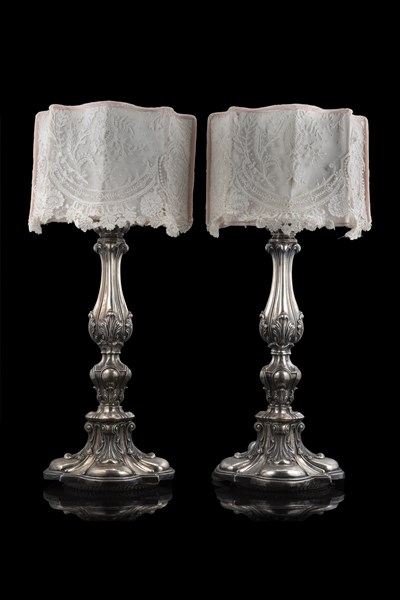 Pair of antique weighted silver candelabras. Electrified in a later period (h. cm 33) (g gross 1600) (defects)