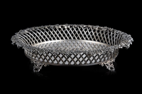 Centrotavola in argento traforato a finto cestello, bordo decorato in rilievo a