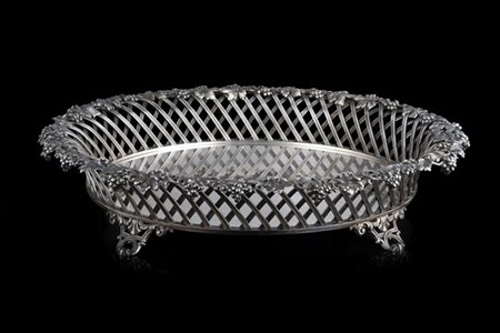 Centrotavola in argento traforato a finto cestello, bordo decorato in rilievo a tralci di vite, piedini sagomati. Titolo 925. Milano, argentiere De Vecchi (cm 37x30) (g 1700 ca.)