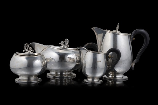 Piedmontese silver tea and coffee set with ebonised handles comprising teapot, coffee pot, milk jug and sugar bowl. Title 800. Silversmith Ricci e C. (g gross 1500) (defects)