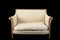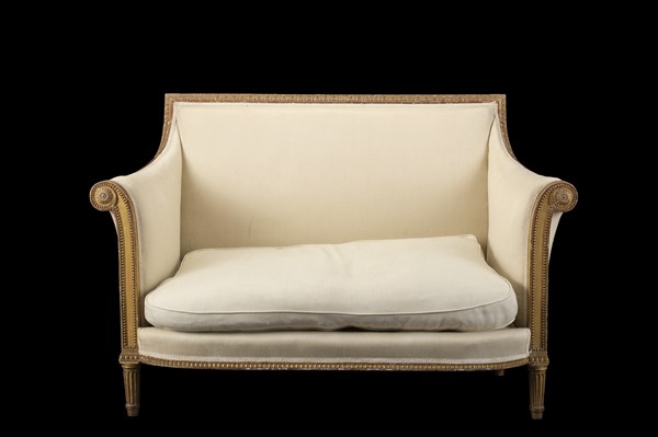 Piccolo divano a due posti in legno intagliato e dorato, schienale squadrato decorato a foglie, braccioli a ricciolo centrati da rosone e profilati con perlinature, piedi scanalati. Secolo XIX (cm 127x83x54) (difetti)