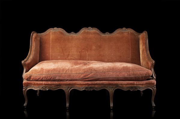 Divano a tre posti in noce intagliato a foglie e fiori con schienale, braccioli e gambe di forma mossa. Rivestito in velluto rosso. Veneto, secolo XVIII (cm 172,5x107x67) (difetti)