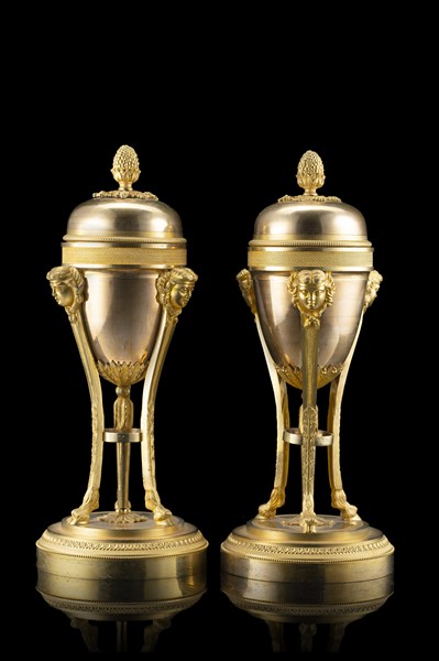 Coppia di candelieri in bronzo a forma di vasi con prese a pigna. Montanti terminanti a zampa ferina su basi circolari decorati all'attacco da mascheroni. Secolo XIX (h. cm 24)