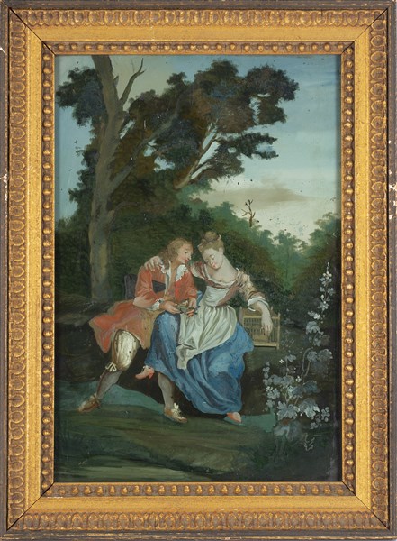 French school, 18th century "Romantic scenes" group of four verre-peints (cm 29x20) In carved and gilded wooden frames (defects)
