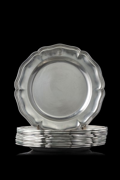 Gruppo di dodici piattini in argento con bordi mossi e scanalati decorati da stemma nobiliare in rilievo. Titolo 800 (d. cm 21) (g 3500)