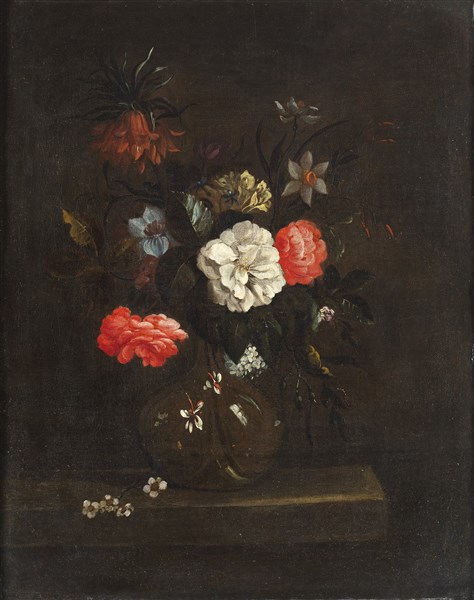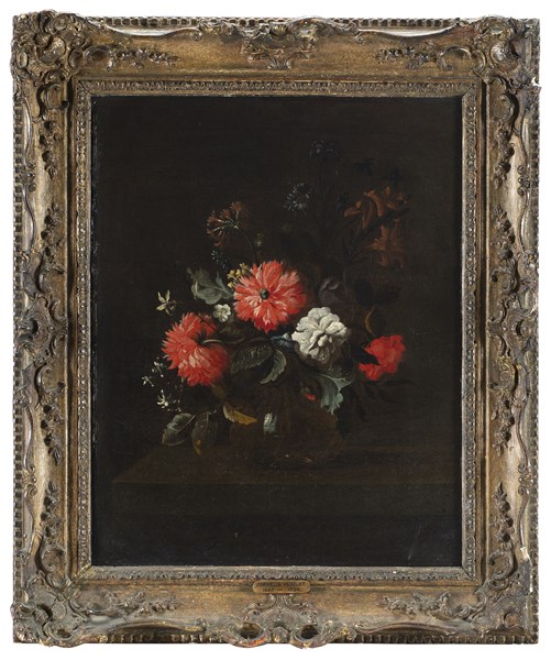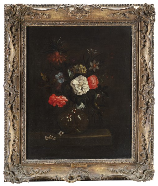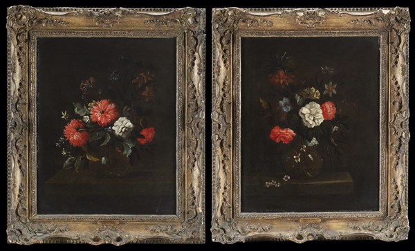 Scuola della fine del secolo XVII Vasi di fiori Coppia di dipinti ad olio su t