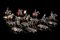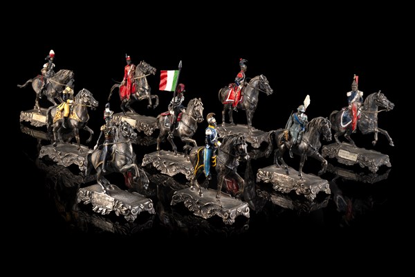 Nove soldatini in argento raffiguranti militari a cavallo con basi squadrate. Targhette incise con nomi dei reggimenti, parzialmente smaltati (g 2200) (difetti)
