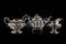 Silver teapot with bone mounts. London, 1840. Silversmiths Joseph Angell I & Joseph Angell II. Combined with a silver milk jug and sugar bowl with vermeille interiors and centred by winged dragon and motto 'For right and reason'. Edinburgh, 1835/1836. Unidentified "W R C" silversmith (g 1545)