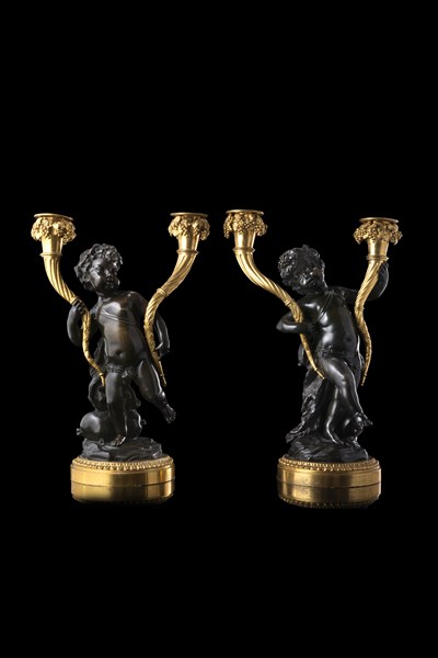Coppia di candelieri a due fiamme in bronzo brunito e dorato a foggia di putti bacchici con cornucopie poggianti su basi circolari. Secolo XIX (h. cm 34) (lievi difetti)