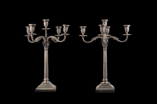 Lot 347 | Coppia di candelabri in argento a cinque fiamme, basi quadrate, fusti scanalati