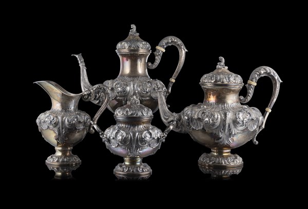 Servizio da tè e caffè in argento composto da: teiera, caffettiera, zuccheriera e lattiera decorate a volute con interno in vermeille. Titolo 800. Milano, argentiere Piero Arioli (g 3000 ca.)