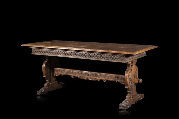 Tavolo rettangolare in noce con fascia decorata a motivo stilizzato e unghiatura sottopiano, montanti intagliati ad assi di coppe riuniti da traversa a greca e volute fogliate. Secolo XVII (cm 194x87x80) (difetti e restauri)