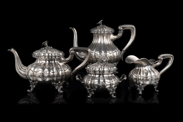 Servizio da tè e caffè in argento titolo 800 composto da teiera, caffettiera, lattiera e zuccheriera. Presa del coperchio a fiore a tutto tondo (g lordi 3450) (difetti)