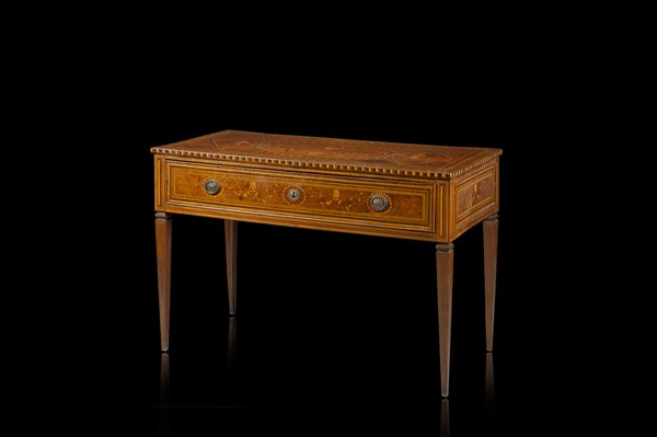 Tavolo da parete ad un cassetto nella fascia, lastronato, filettato e intarsiato a motitivi geometrici, mascheroni con coppe e rami fioriti. Gambe rastremate. Fine secolo XVIII (cm 125x82x60) (lievi difetti e restauri)
