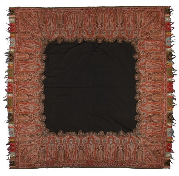 Scialle Kashmir, Lione, Francia, fine secolo XIX. Decoro con alta fascia lungo i bordi e motivi Kashmir. Grande riserva centrale lana e seta color nero tinta unita (cm 180x180) (difetti)