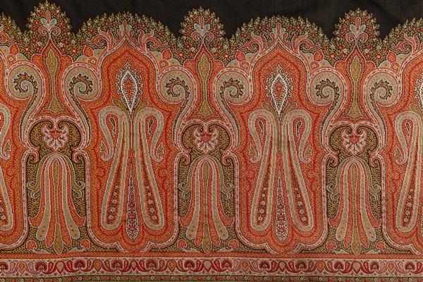 Scialle Kashmir, Lione, Francia, fine secolo XIX. Decoro con alta fascia lungo