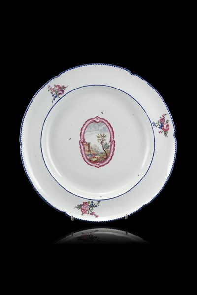Manifattura di Niederwiller, piatto in porcellana. Cavetto centrato da cartella con figure in un paesaggio. Falda decorata con mazzi di fiori (d. cm 36) (difetti)