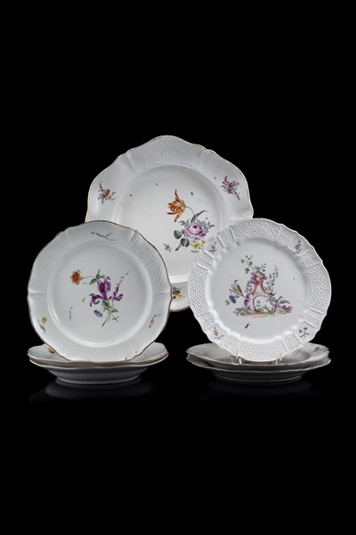 Manifatture differenti, lotto composto da un piatto da portata e sei piatti diversi in porcellana dipinta in policromia a motivi floreali. Falda decorata a rilievo e bordo mistilineo (d. max cm 33) (difetti, rotture e mancanze)