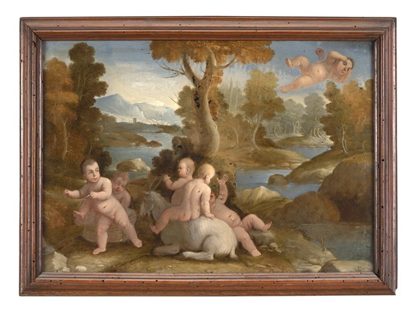 Lot 396 | Scuola del secolo XVIII "Putti che giocano con la capra Amaltea" verre-peint (c