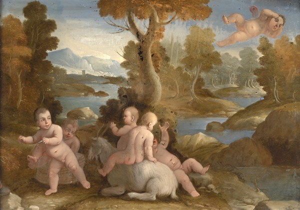 Scuola del secolo XVIII "Putti che giocano con la capra Amaltea" verre-peint (c