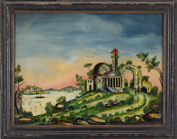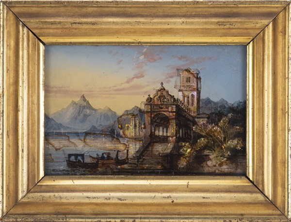 Schools of the 19th century "Landscapes with figures" two mother-of-pearl inlaid verre-peints (cm 10x16; cm 20x26) In wooden frames (minor defects)