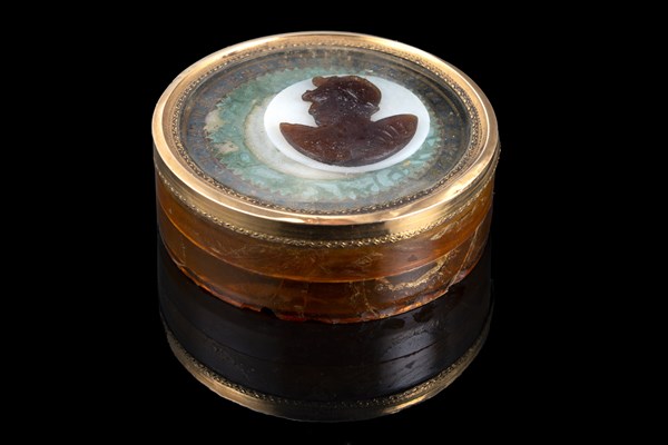Tabacchiera in tartaruga bionda con coperchio decorato da ghiera in oro e cammeo con profilo classico. Secolo XIX (cm 6) (difetti)