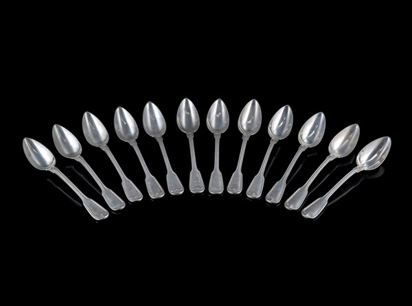 Group of twelve silver teaspoons with noble coats of arms on the back (g 360 ca.)