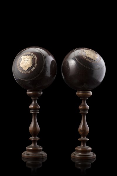 Coppia di bocce in legno con targhette commemorative in metallo argentato iscritte e datate 1866 (lievi difetti)