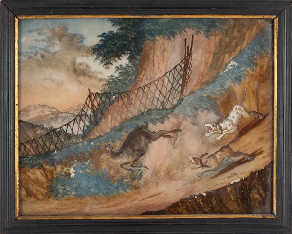 School of the 19th century "Deer hunting" verre-peint (cm 25x32) In wooden frame. Dedication on the back