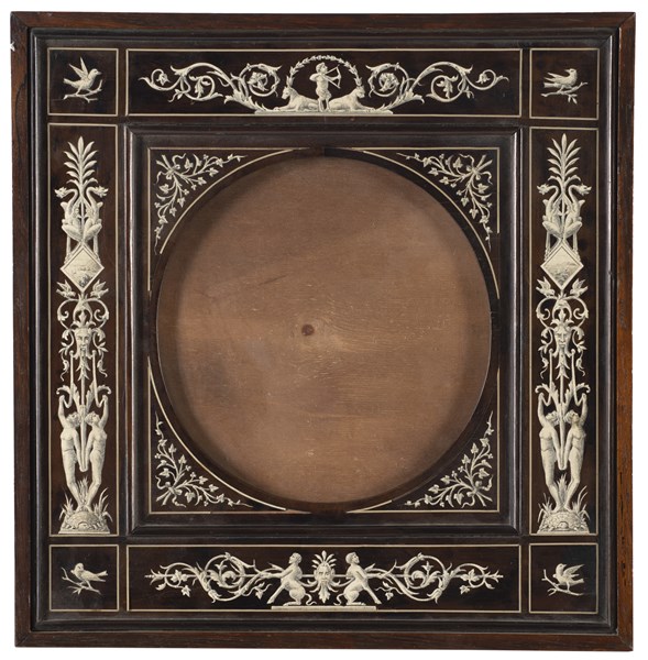 Pogliani's workshop. A wooden frame decorated with ivory inlaid classical figures, landscapes and animals (cm 32x33, internal side d. cm 18) (defects and losses)
