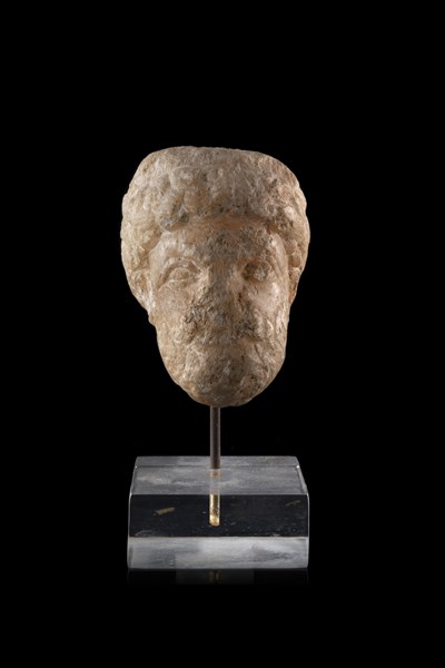 A small alabaster male head (h. cm 7,5) on plexiglass base (h. tot. cm 11) (defects)