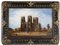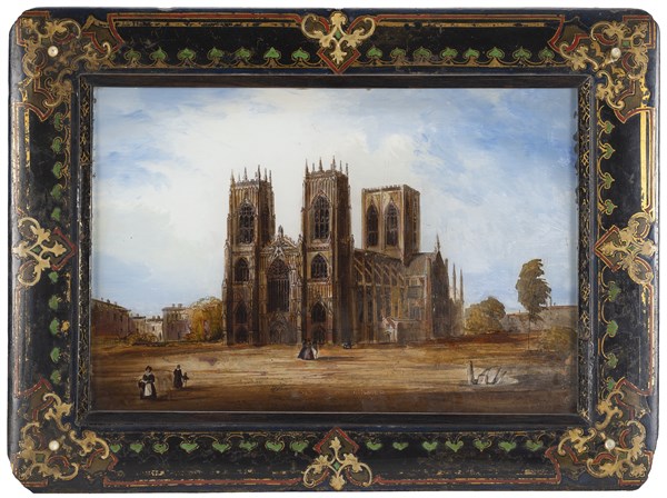 Scuola inglese, secolo XIX "York Minster" verre-peint con inserti in madreperla. Titolato e iscritto al centro (cm 15x22,5) In cornice in legno laccato e decorato in policromia e dorature a motivi stilizzati e volute fogliate (lievi difetti e restauri)