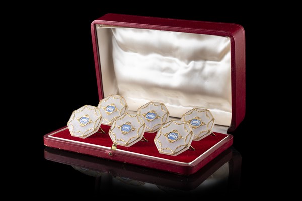 Gruppo di sei segnaposto ottagonali in quarzo latteo con applicazioni in metallo dorato centrati da inserto in wedgwood raffigurante una lupa che allatta un bambino e scena di lotta tra animali (d. cm 4,3) In custodia (difetti)