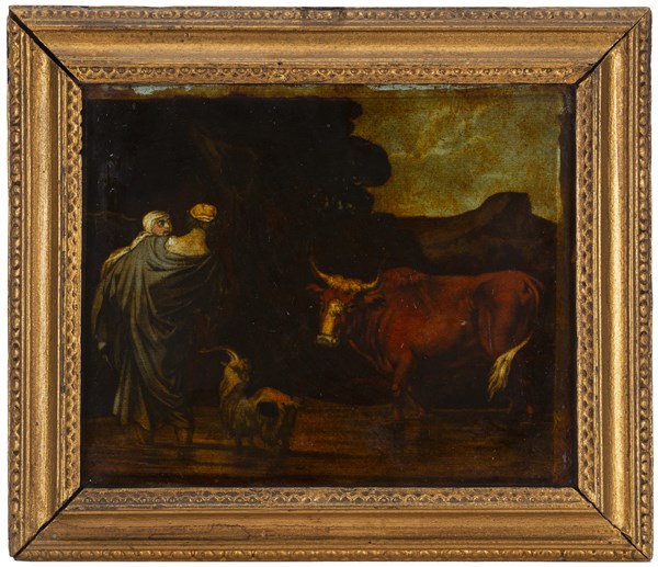 Scuola del secolo XVIII "Scena campestre" verre-peint (cm 14,5x18) In cornice in legno dorato