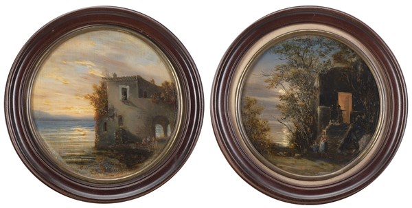School of the 19th century "Landscape with figures" two circular verre-peints (d. cm 10) In wooden frames (defects)