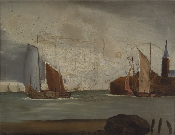Scuola del secolo XIX "Paesaggio con barche" verre-peint (cm 36x47) In cornice