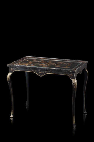 Tavolino in legno laccato a chinoiserie e dorature, piano decorato a volatili e fiori. Gambe mosse. Inghilterra, secolo XVIII (cm 90x69x54,5) (difetti)
